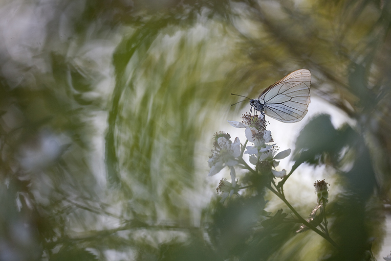 Lo sfondo è del semplice fogliame (in pratica ero in mezzo a un grosso cespuglio fatto tutto di rametti come quello su cui poggia la farfalla) frapposto tra l'obiettivo e il soggetto.