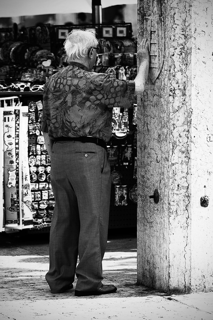 Come "street&life" non mi dice molto: un signore di spalle e uno sfondo invadente a sinistra. L'abbigliamento è estivo, la foto non dice quanto caldo sia: appoggiarsi può essere anche segno d'età.