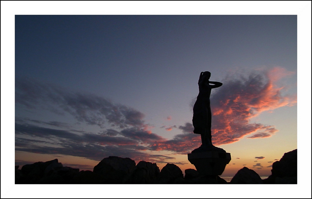 Il cielo è molto bello, l'esposizione buona, l'immagine piacevole e nitida. Le impostazioni della macchina inappuntabili, direi, e la resa molto buona. Tuttavia secondo me l'immagine è penalizzata dal fatto che la statua, pur correttamente posta su una linea di forza, è rivolta verso l'esterno della foto. Penso che, se tu avessi scattato da una posizione più a destra, in modo da avere la statua sull'asse dei terzi di sinistra invece di quello di destra, e quindi rivolta verso l'interno della foto, il risultato sarebbe stato assai migliore.