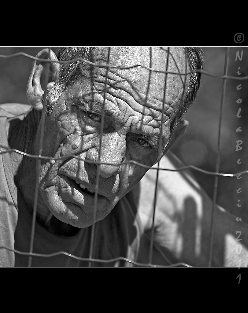 ...La scavata geografia di rughe, ..incise come solchi sulla pelle bruciata dal sole, "litiga" un pò con il primo piano delle maglie della rete e con le ombre che questa proietta sul viso.