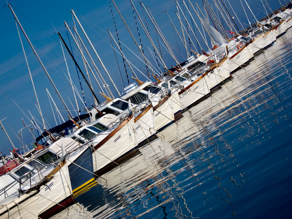 Mi permetto di darti la mia opinione. Personalmente ho un problema con le composizione oblique (per me sono tutte irrimediabilmente "storte", ma è un mio problema). In questo caso non ci sta male, anche perché il riflesso gioca a favore di una composizione simmetrica. Ci sta poi anche bene l'effetto prospettico delle barche che si rimpiccioliscono verso l'alto e a destra: le prue sono compositivamente delle "frecce" che spingono lo sguardo verso quel punto.
