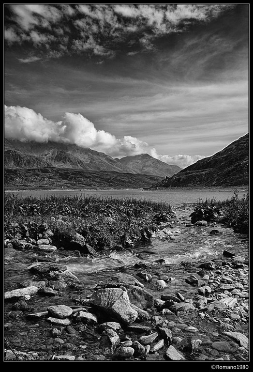 Mi piace molto questo paesaggio, con il rivolo che guida l'occhio al centro del frame per poi aprirsi all'interno del lago(?). E anche il celo contribuisce, con le nuvole, a dare dinamismo o dinamicità alla foto...