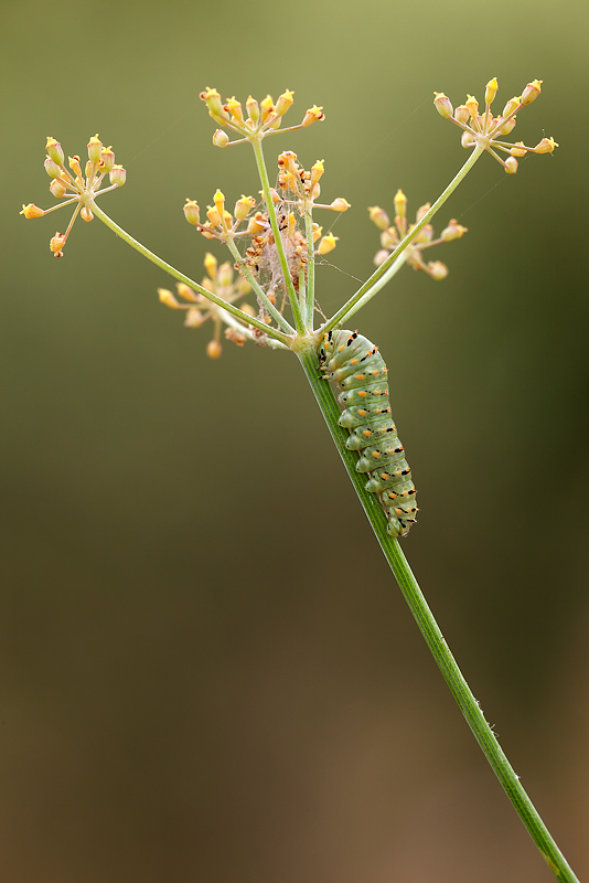 Il soggetto ripreso e' un bruco di macaone della seconda generazione alla sua seconda muta, si notano ancora le spinette sul dorso.Ho voluto riprenderlo insieme al suo cibo preferito il finocchio selvatico ma quello che mi sorprende di più sono i semi di questa pianta che visti con un 180 mm sembrano proprio delle piccole lanterne.