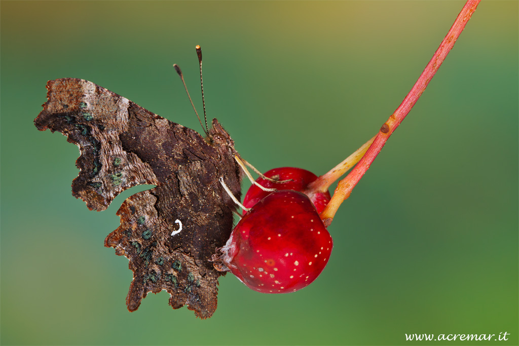 Questa Polygonia c-album era posata sopra alle rosse bacche del Sorbo.