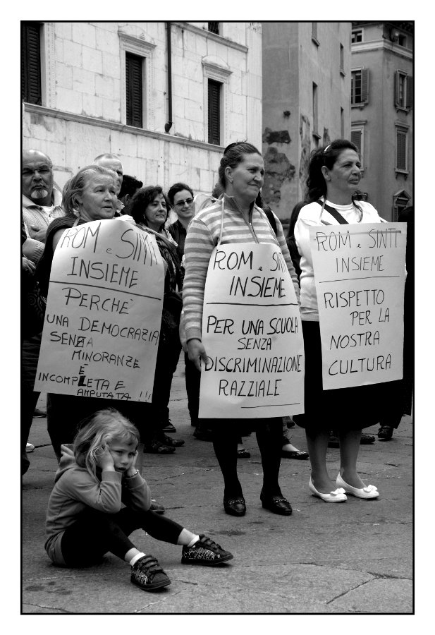 | Liliana R. ha scritto: | Mentre scrollavo l'immagine mi è sembrata più efficace con un taglio dell'immagine che comprendesse parte dei manifesti, compresa la scritta "insieme" al centro, e la sola bimba come centro d'interesse.