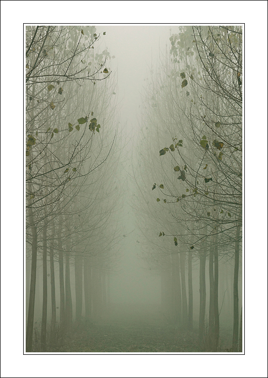 elegante simmetria di questi alberi oppressi dalla nebbia...delicate e sparute foglioline aggiungono un tocco in più allo scatto...ciao...  |