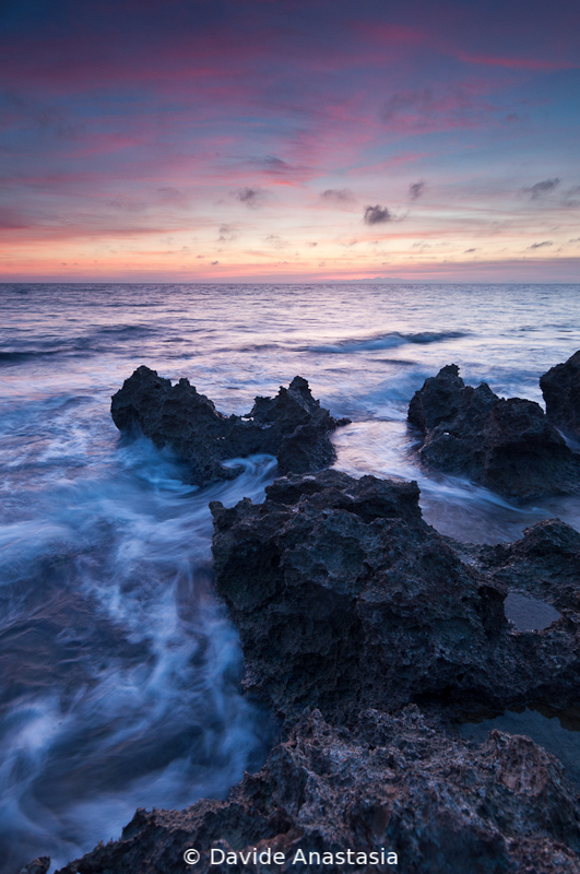 di grande fascino ed atmosfera questi scatti marini. Scie setose formate dall'acqua, cieli rosati, il duro contrasto fra roccia dura e scura e delicate e sfumate cromie.