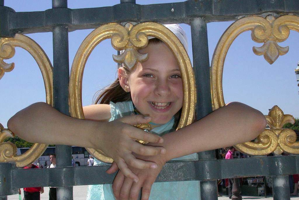E' una simpatica foto ricordo volendola commentare dal punto di vista fotografico però ha almeno due problemi. Il primo è la luce: lei è in ombra, e questo spegne il bel sorriso Il flash contribuisce ad appiattire l'immagine, che invece avrebbe guadagnato molto dalla luce del sole. Il secondo è il taglio, attraverso questa grata o cancello fa apparire la foto stortissima: in questo caso o la raddrizzi decisamente con photoshop, oppure pensa in fase di scatto ad un uso creativo della stortura, aumentandola esageratamente.