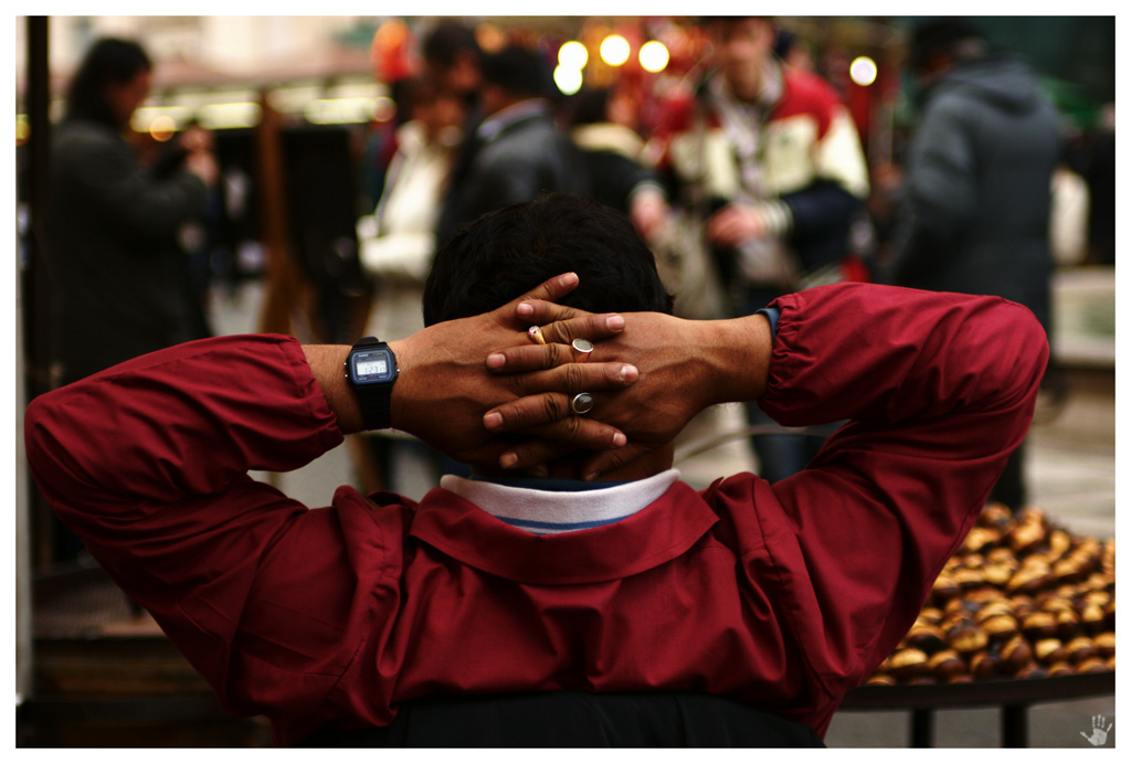 Peccato però che la testa si perda nello sfondo, ma mi piacciono i colori e la folla sfuocata. Della serie "mentre tutti si sbattono andando in giro io me la godo e mi riposo"! Ok!