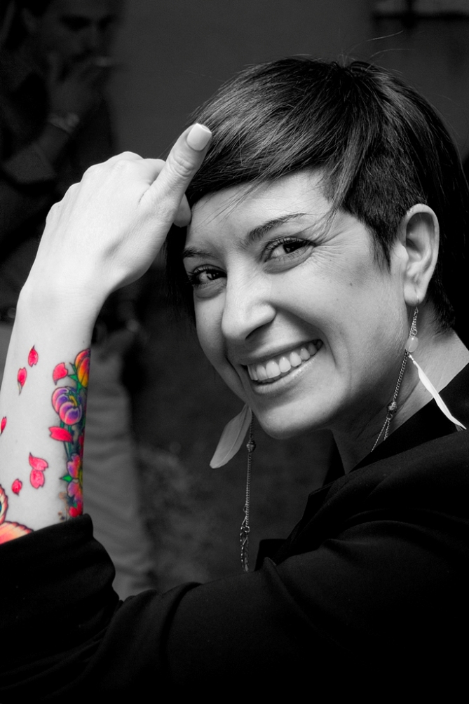 buona l'espressione colta e molto spontanea che caratterizza un ritratto "fresco". discreto anche il bn dai toni morbidi e ben leggibili su tutta la gamma. peccato per la figura che si intravede sullo sfondo, sporcando la composizione. anche secondo me la nota di colore che hai voluto lasciare nel tatuaggio non aggiunge nulla allo scatto.