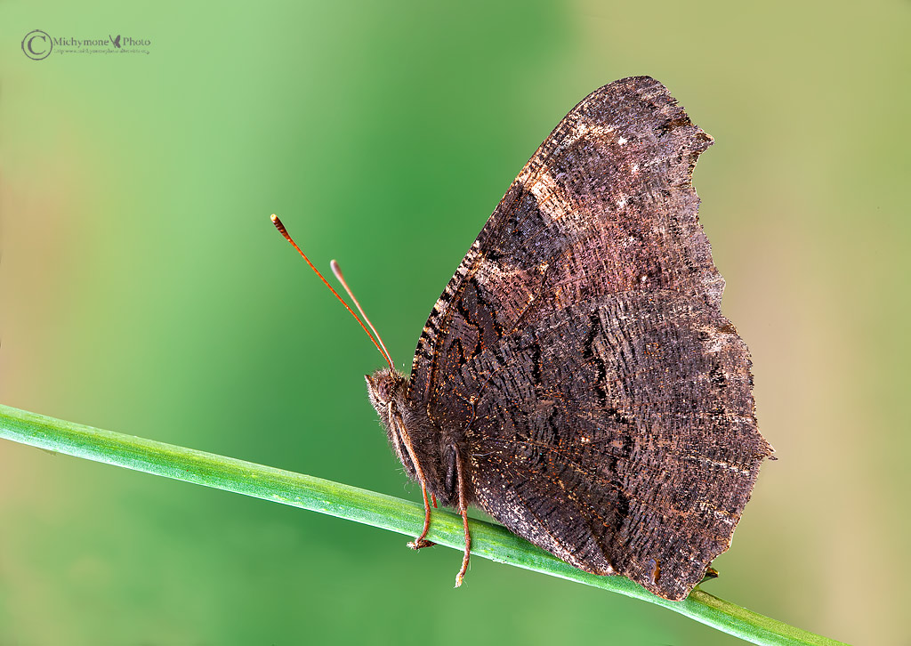 La parte inferiore è invece nerastra, per facilitare il mimetismo quando la farfalla è posata su tronchi o superfici scure.