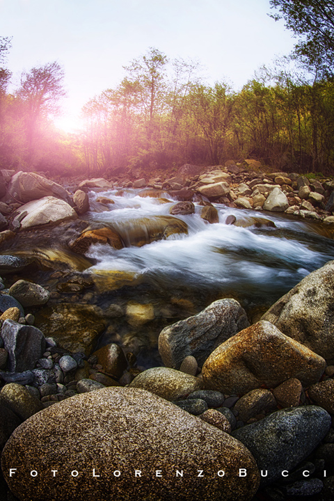 Il risultato è interessante andando dall'estreme nitidezza del primo piano sino allo sfondo reso evanescente dal potente flare solare; in mezzo l'effetto seta dell'acqua a mitigare i due opposti