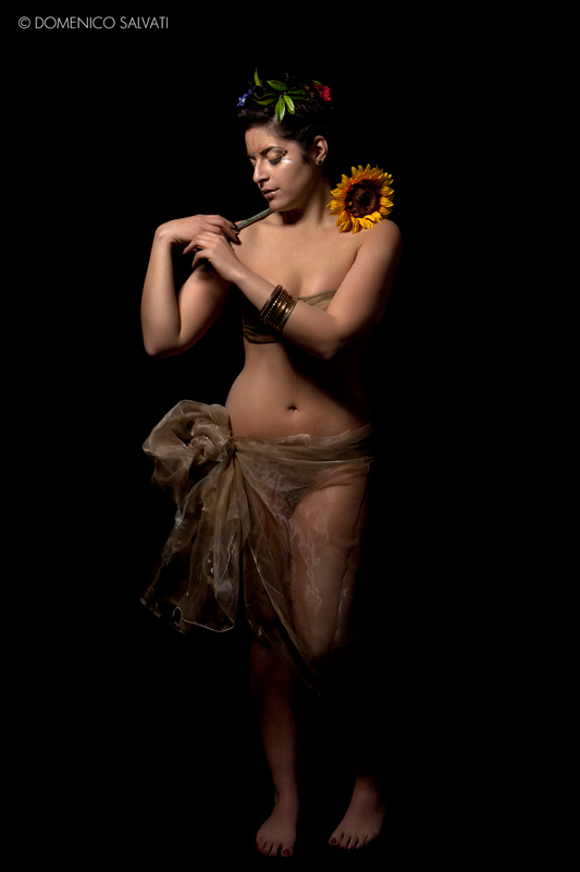La luce usata, la gestualità della ragazza, la sua silhouette generosa e quel velo rendono questa foto veramente bella, quasi Botticelliana; i fiori stonano.