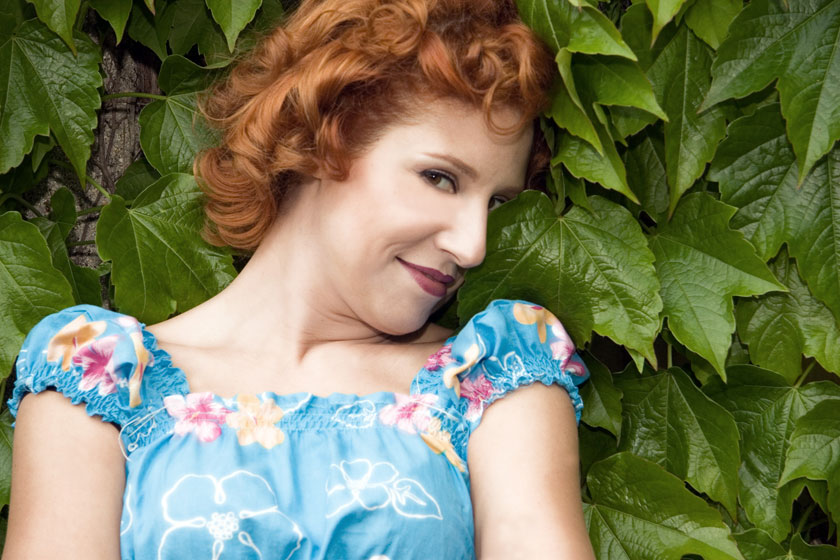 molto particolare ed interessante questa sensazione di piacevole contatto con la natura che si ricava dalla visione di questo scatto. di sicuro impatto gli accostamenti cromatici presenti sulla scena (il celeste del vistito, il verde del fogliame e il rame dei capelli). divertente e compiaciuta l'espressione di lei. l'inquadratura è frontale, ma l'inclinazione del capo aggiunge un bel dinamismo alla posa.