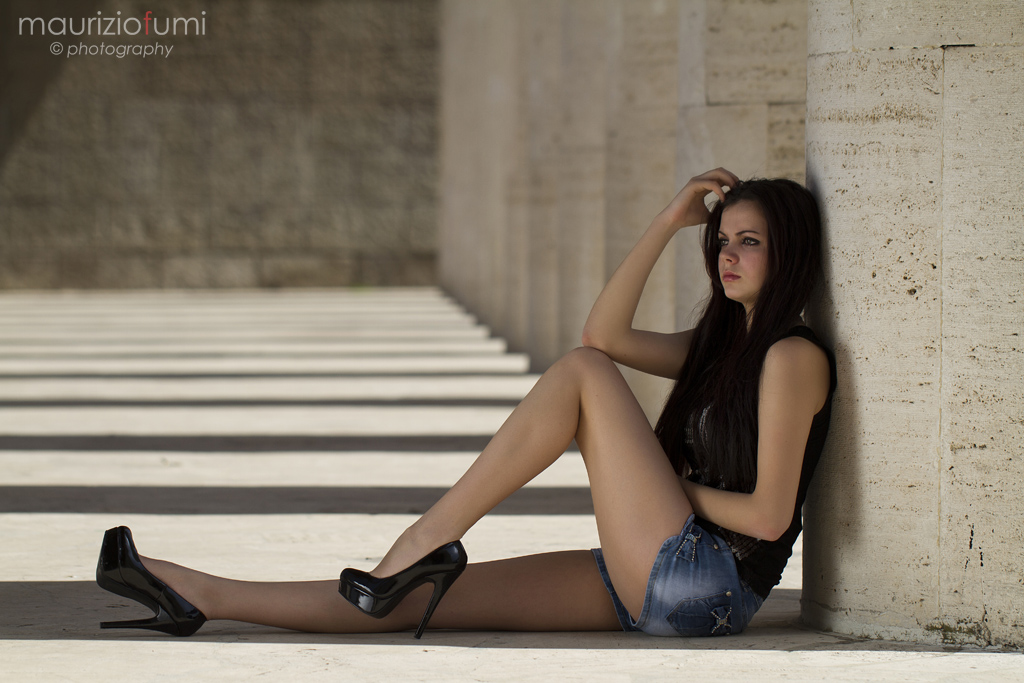 Sulla composizione in questo caso ho cercato di far poggiare la modella quasi al limite del piede del fotogramma, per dare maggiore profondità sfruttando le linee architettoniche del colonnato, negli altri scatti come suggerivi tu ho verificato che questo aspetto un po' tendeva a perdersi.