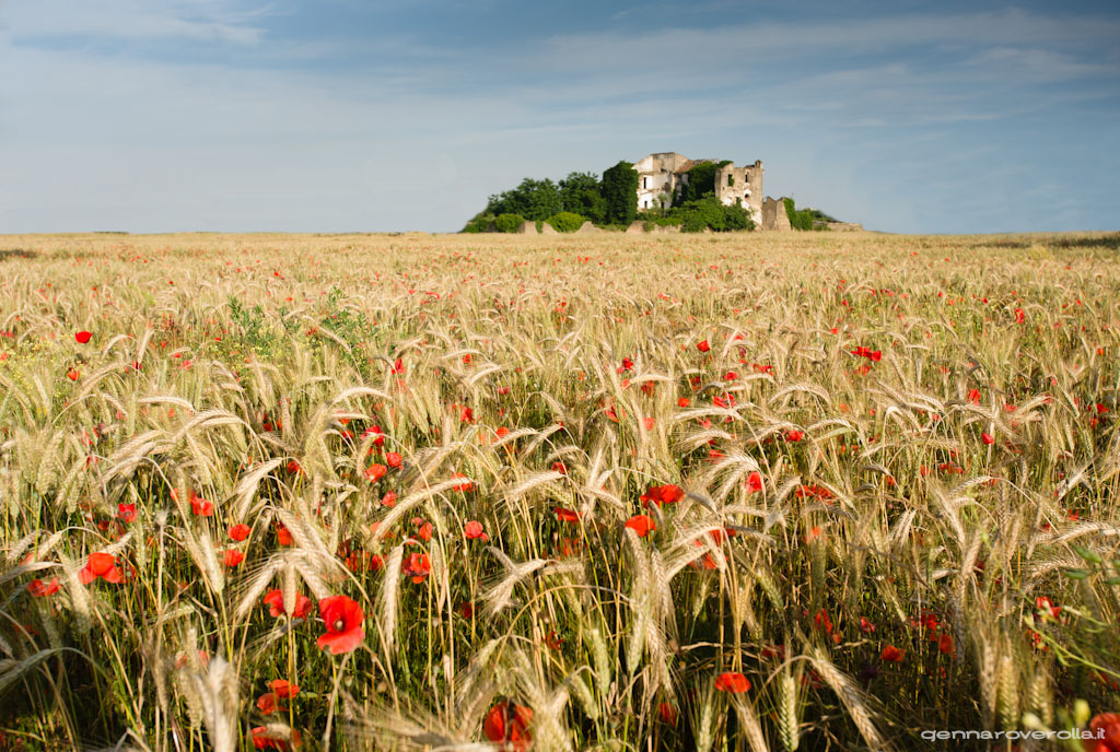 Molto belle quelle macchie di rosso che qua e la interrompono il monocromatico biondeggiare del grano. Ottima la composizione, anche se l'efficace dinamismo introdotto con una ripresa dal basso viene leggermente meno con il casolare diroccato posto al centro. _________________ Riccardo Bruno |
