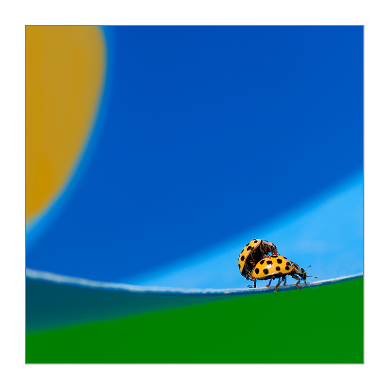 Splendida la cornice cromatica in cui hai immortalato il momento amoroso delle coccinelle.