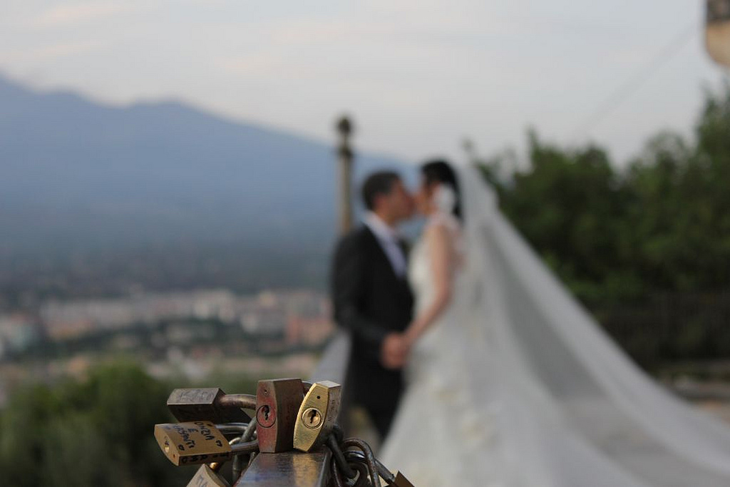 Il palo dietro allo sposo era difficilmente evitabile ma quella macchia marrone sfocata in alto a destra si, bastava optare, per esempio, per un'inquadratura verticale... così facendo avresti preso più lucchetti, più ringhiera (per un maggior effetto di profondità) e avresti, forse, anche preso tutto il vestito della sposa.