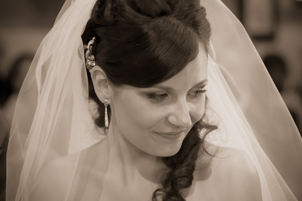 Lo scatto merita senza dubbio, mi piace la luce, l'ombra leggera sulla fronte, l'espressione della sposa, il viraggio con una lieve quanto delicata tonalità seppia, e mi incuriosisce pensare a cosa stia guardando con compiacimento. Forse allo sposo? Forse agli anelli?