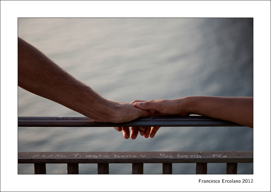 La mano di lei che s'intreccia con la sua, la scritta sulla ringhiera e dietro il mare.