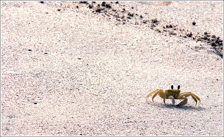 il taglio mi piace, il granchietto è bello nitido e mi pare a fuoco, ma la sabbia la trovo troppo innaturale nella foto "lavorata"...