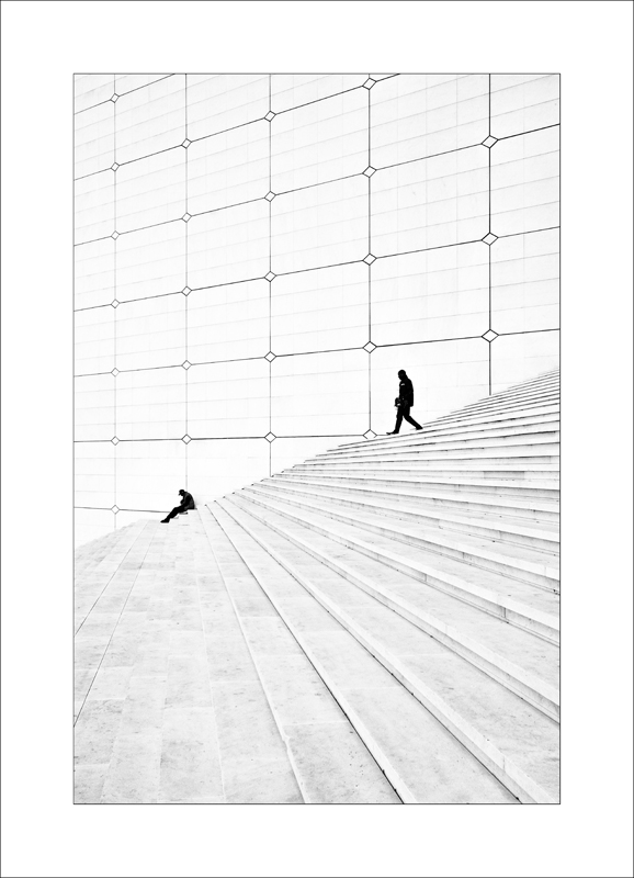 Ottima composizione studiata e ben realizzata, le figure umane si fondono perfettamente nell'abitat grafico creato dai gradini e dalle pareti; mi piace anche la chiave luminosa della scena con le figure solo silouette.