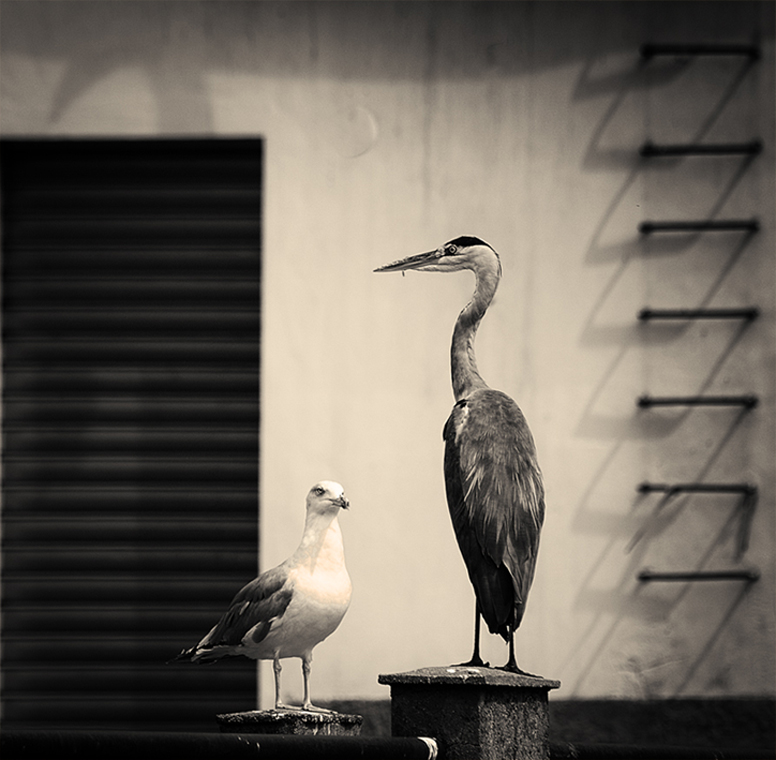 Bel risultato (che oramai si può cominciare a riconoscere come "tuo"). Belli quegli elementi grafici sulla destra, l'ombra curva in alto, la misura dello sfocato; appena un po' invadente e pesante l'altro elemento scuro (una porta?, una finestra?) a cui si sovrappone il gabbiano. Ma era lì...