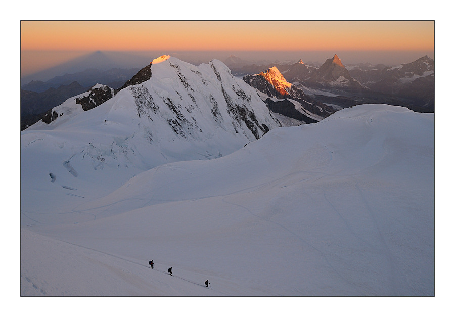 Quasi un atto d'amore alla vera filosofia dell'escursionismo in quota. Fissato nella delicatezza di questa luce che rende raggianti di rosa i picchi, e ne smorza in basso i toni maesatosi in dolcezza. Le tre figure in discesa hanno una grande importanza con le loro pur minuscole presenze: rivelano, se ce ne fosse bisogno, le dimensioni in gioco... in questo rapporto speciale fra uomo e natura montana.
