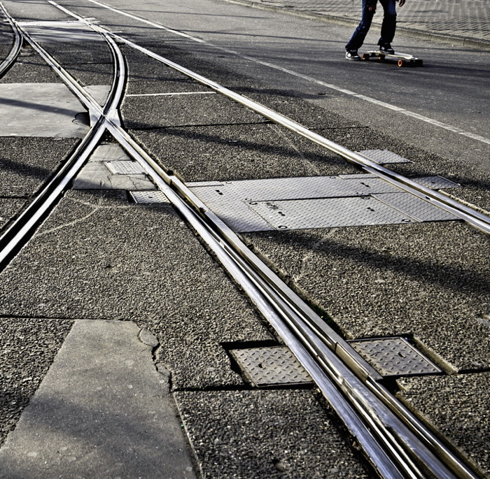 Non male queste geometrie disegnate dai vari elementi in gioco (rotaie e segnaletica orizzontale), buona la composizione e la scelta della diagonale...
