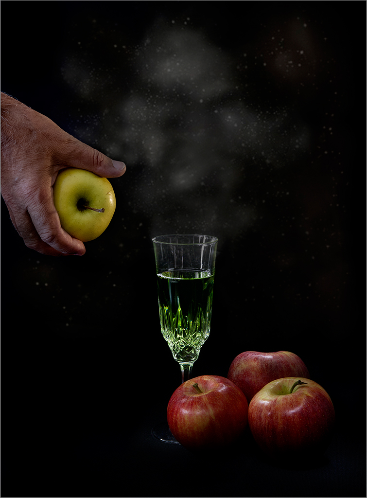 Il fumo, la mano con la mela, l'alcol, nascono da una mia idea, che probabilmente non è arrivata. senza uno di questi elementi sarebbe stata