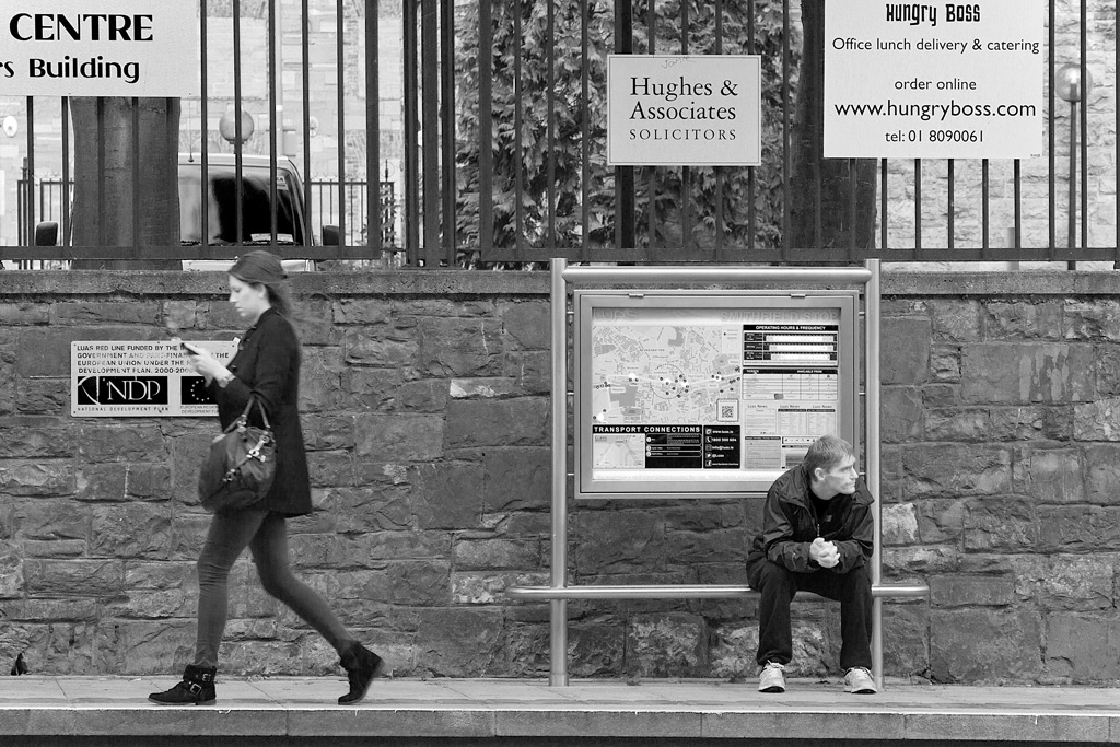 forse non riesco a capire il dialogo tra i cartelli appesi alla ringhiera, il titolo e i due soggetti: cioé se fosse una fancy lady allora il tizio non dovrebbe guardare dall'altra parte. Per cui tolto il titolo lo sguardo verso destra e il senso del passeggio verso sinistra sono elementi che bilanciano la composizione. Che mi piace per le simmetrie che hai creato, a cui pero' manca qualcosa...