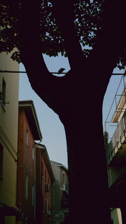 Un contrasto con lo sfondo dai colori caldi, ambiente riconoscibile, una strada cittadina come c'è ne sono tante, la silhouette dell'albero in primo piano si impone con una forte presenza e senza possibilità di poterlo aggirare con lo sguardo.
