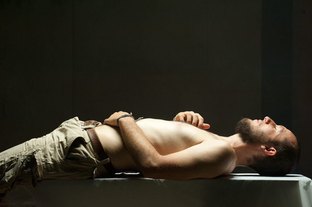 In questa foto non avevo a priori un vero e proprio intento comunicativo, ho scattato e mi è piaciuta. E' una foto di backstage, il ragazzo è un direttore della fotografia che faceva da stand-in per le misurazioni dei fuochi per un cortometraggio, era a torso nudo perchè era piena estate. Il tavolo rigido, il fumo nell'aria e la luce dall'alto mi hanno fatto pensare ad un obitorio, l'espressione serena ad occhi chiusi alla morte come ad un riposo. Ciao buona giornata