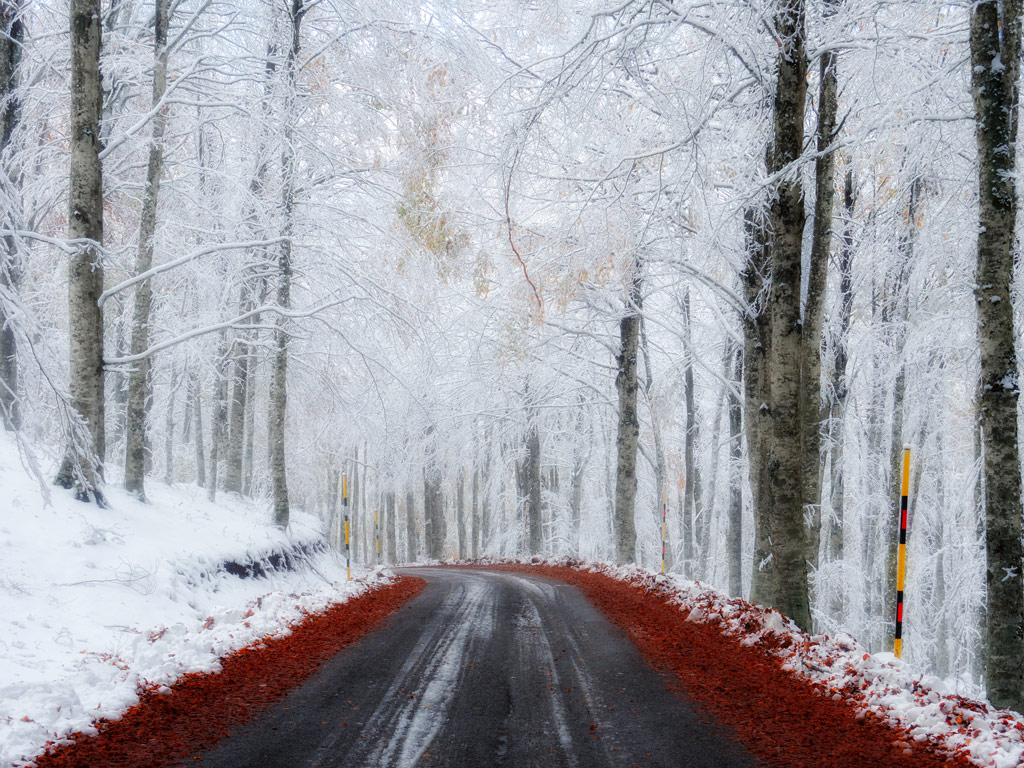 il contrapporsi di strada e rosso delle foglie con il cnadore della neve la fa da padrone!