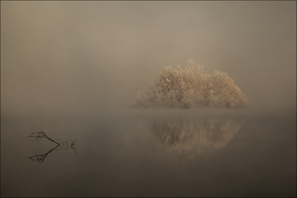 Il cespuglio imbiancato con una miriadi di dettagli e particolari, con una forma fotograficamente "perfetta", lambito da una luce stupenda. Il suo riflesso appena accennato. In diagonale il rametto con il suo riflesso. In una totale e completa immobilità invernale. Niente turba il rapporto tra il fotografo e questo piccolo angolo di mondo.