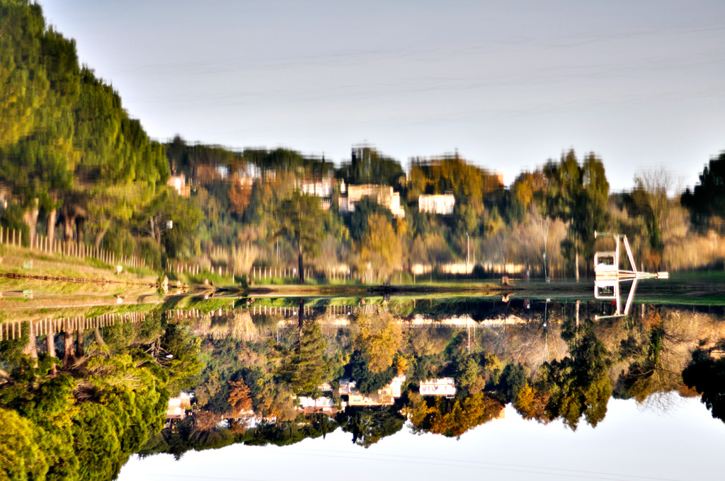 i colori sono notevoli ma onestamente non capisco se la foto l'hai capovolta e lo specchio d'acqua ora sta sopra o se l'hai postprodotta sfocando il panorama e lasciando lo specchio d'acqua intatto.