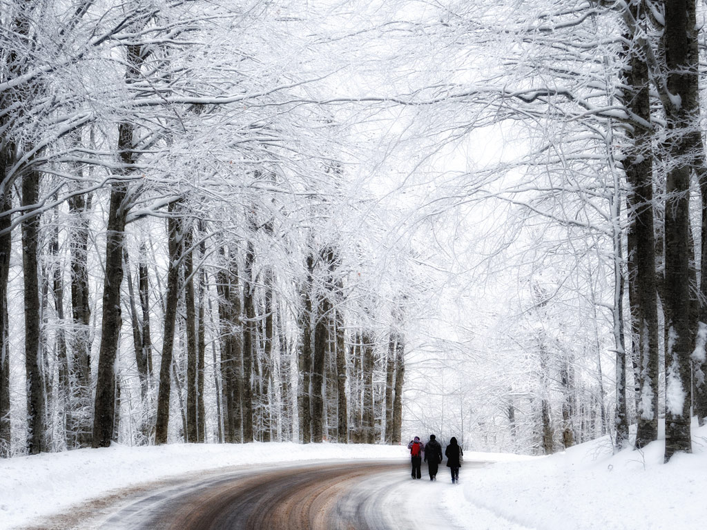 La foto è ben condotta, atta ad esaltare l'incredibile intreccio di rami innevati che fanno da tetto-capanna alla passeggiata dei tre. Ottima anche la linea guida ricurva dell strada con la sua conduzione visiva in scuro in questo mare di chiarore. Il flou è una sclelta che dipende dal gusto personale: soggettivamente io non la avrei operata, dando così più risalto i netti, crudi abbaracci di rami , un po' da foresta incantata, il cui impatto spoglio è comunque ammorbidito naturalmente dalla spessa nevicata.