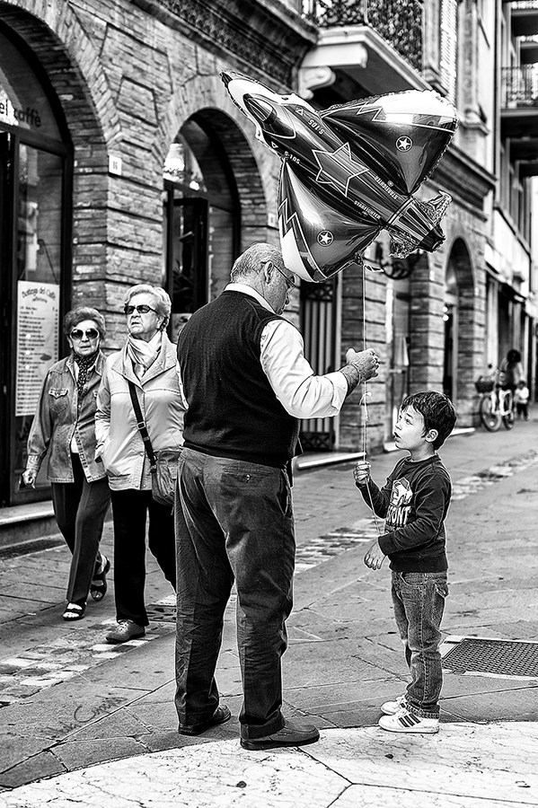 Secondo me meglio a colori (con un minimo di aggiustamenti nel contrasto/saturazione e tagliando sotto in formato 4:3): il palloncino attira subito l'occhio, la base della foto è meno chiara e le signore hanno meno modo di disturbare.
