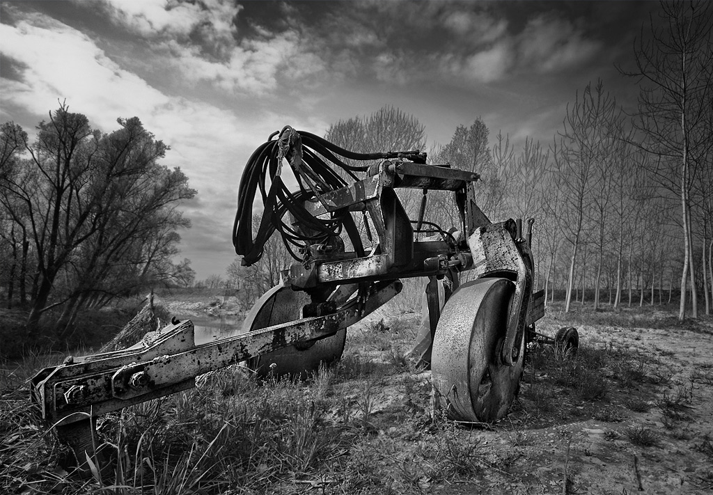 Curiosità: si vede che è un aratro, ma viene trainato dal trattore? Cioé, non ha un suo motore. Le ruote lisce mi incuriosiscono parecchio! | ciao, credo che venga trainato da un trattore cingolato e serve per arare nelle piantagioni di pioppi. |