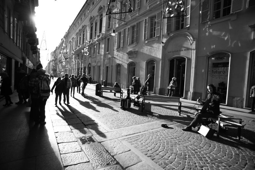 L'ambientazione allargata e la luce dura lasciano il suonatore abbastanza al margine, si vede l'archetto ma lo strumento è un'ipotesi.