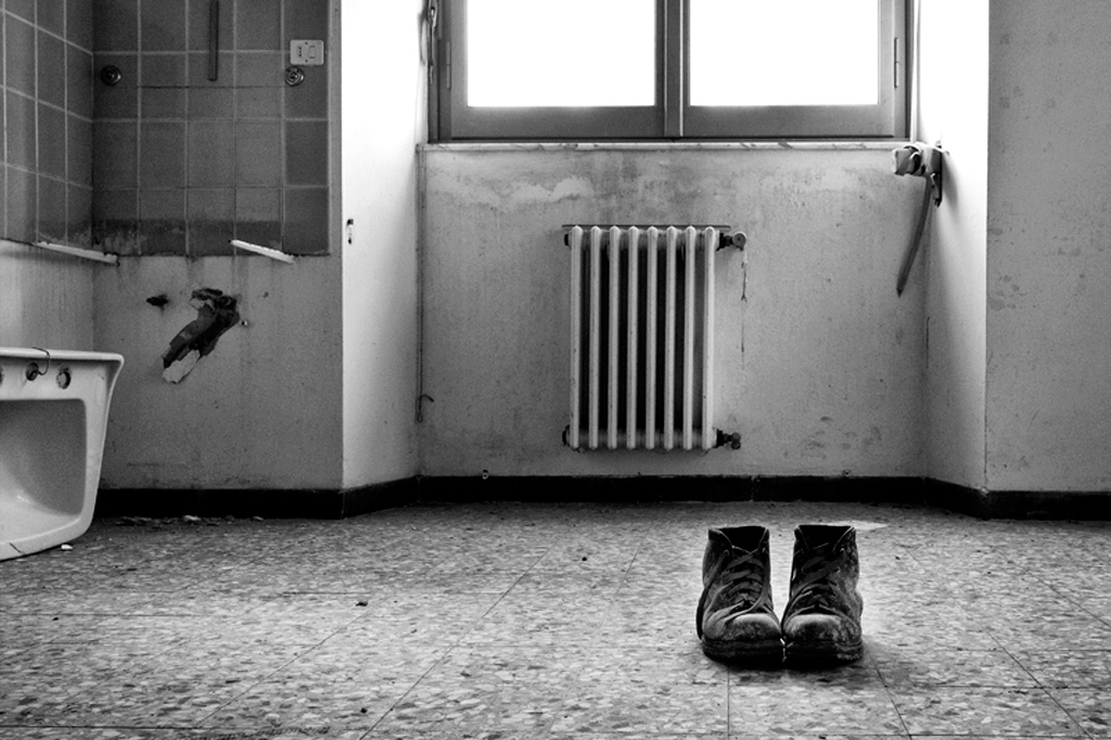 Ciononostante non ho saputo resistere e anche in questo vuoto ho raccolto delle presenze umane, raccontate però in maniera indiretta grazie ad elementi quali le scarpe, il letto evidentemente tuttora in uso e gli stessi banchi di scuola.