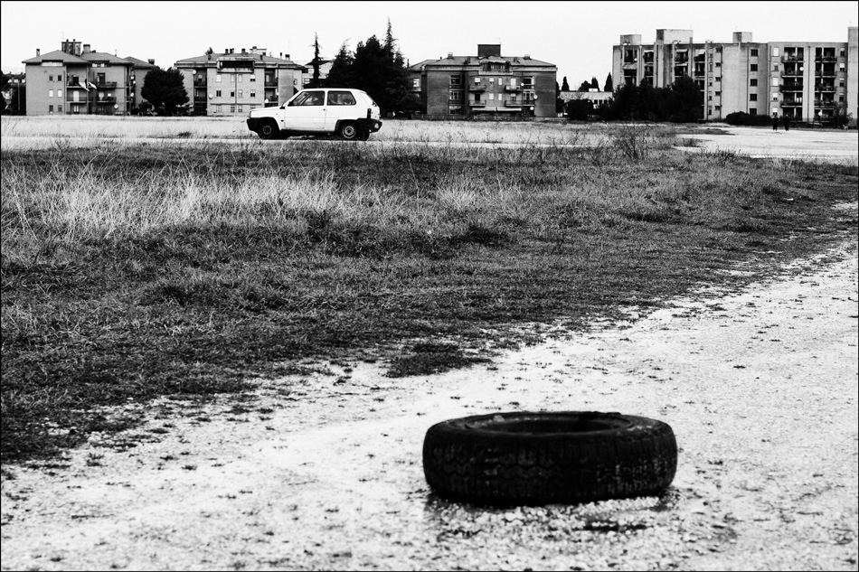 | bello scatto. probabilmente x le alte luci si può conordare col Webmin, xò c'è un buon richiamo tra la gomma e la macchina (che preferisco ferma così com'è, tanto da sembrare anche lei un rifiuto...), che nell'insieme con gli edifici dall'aria triste sullo sfondo vanno a creare un'atmosfera piuttosto malinconica e decadente... |