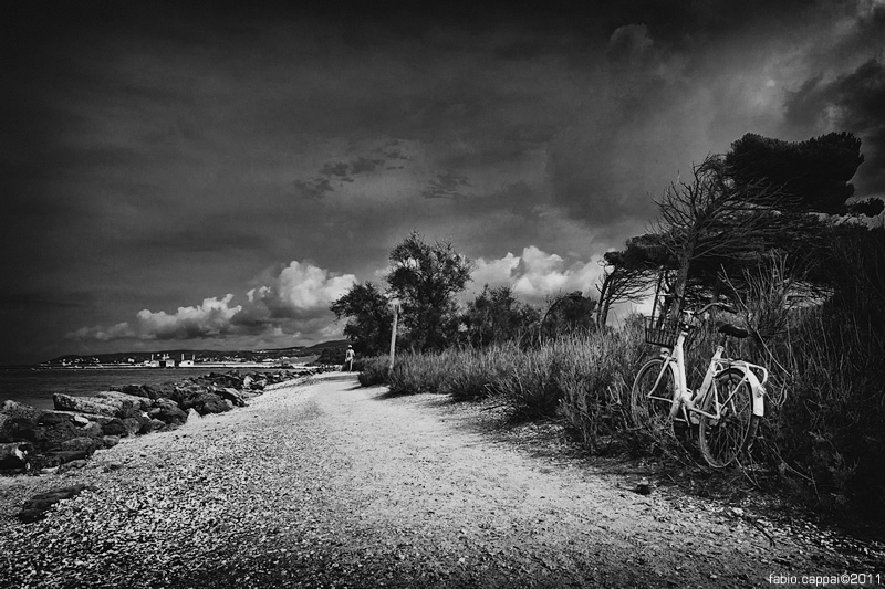 Non è solo una foto di paesaggio. La bicicletta abbandonata sul lato della strada e la figura sullo sfondo, sono come una traccia di un racconto in sospeso. Stile inconfondibile e bn molto personale.
