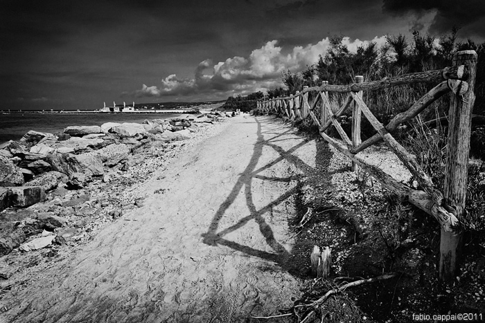 La foto e' ben giocata, a livello compositivo, sulla staccionata e la su ombra e sul proseguimento della diagonale con le nuvole, che arrivano fino all'orizzonte.