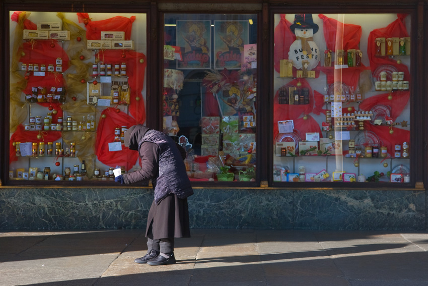 Una foto amp non banale di un soggetto altrimenti abusato. Basta il lampo bianco del bicchiere per raccontare la mendicità in opposizione alla vetrina delle Feste, mentre la persona ne resta esclusa anche cromaticamente.