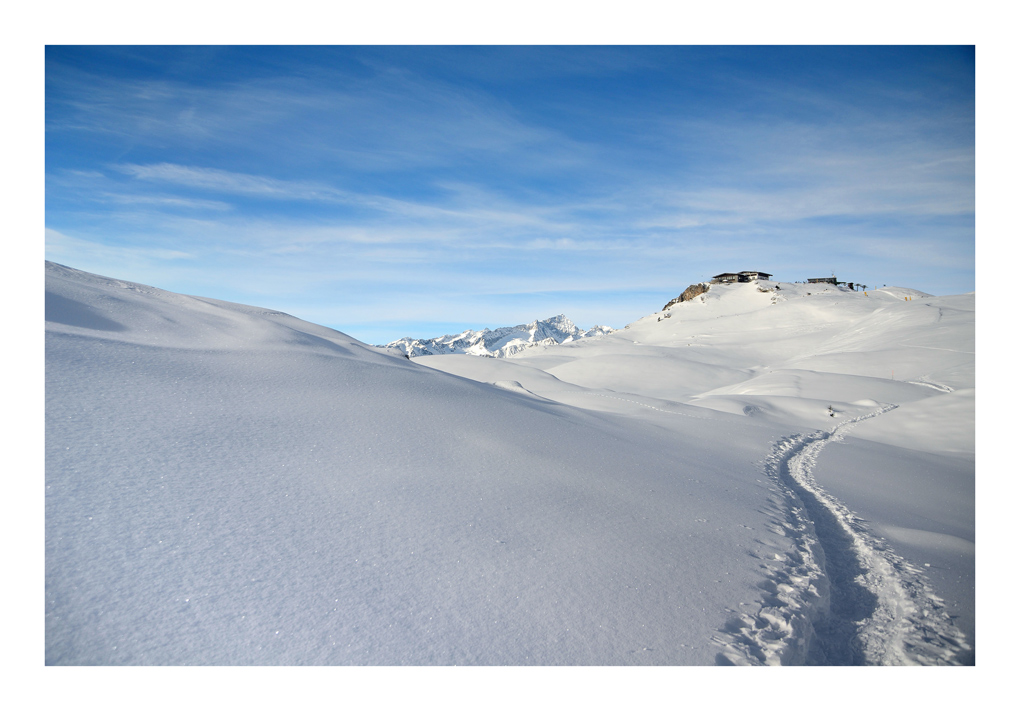 Un bel primo piano con i cristalli di neve e la traccia che porta non solo al rifugio ma anche, da un punto di vista compositivo, porta nel cuore dell'immagine. Anche se fatta in pieno giorno, le tonalità del cielo sono piacevoli e con un blu non esagerato (come spesso capita di vedere).