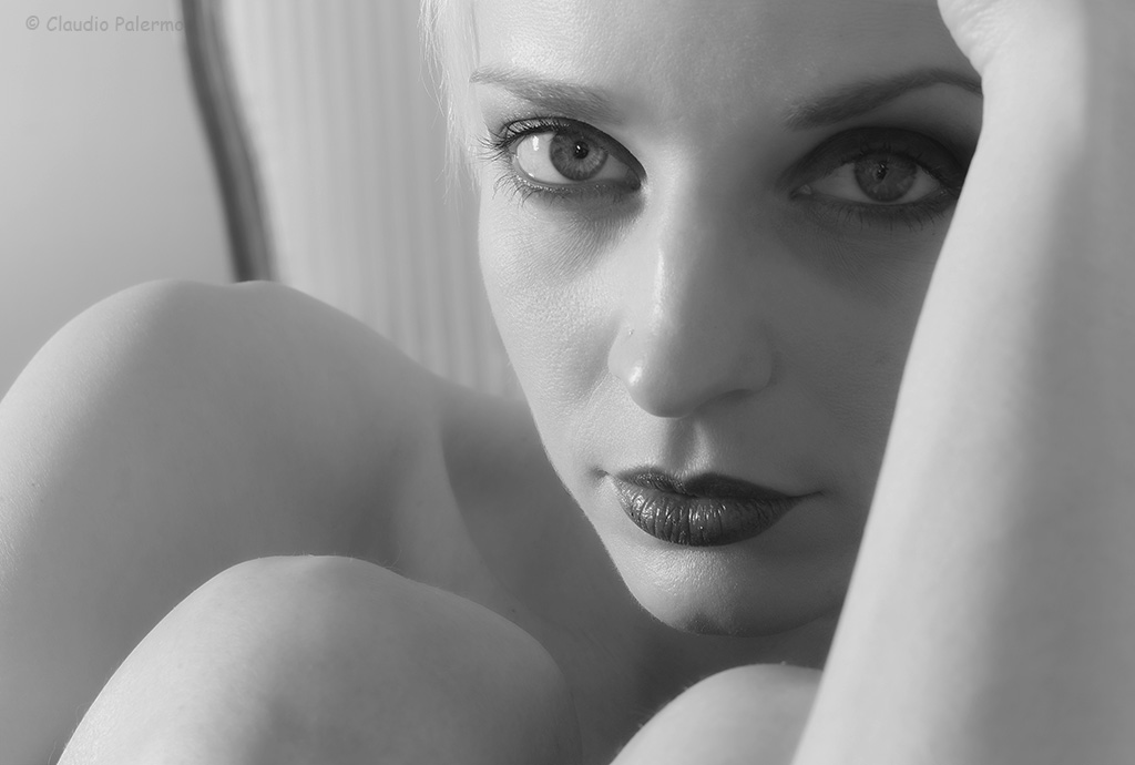 mi piace il taglio del viso contornato dalle parti del corpo e la luce non è male. Però disturbano le righe sullo sfondo e vedo l'occhio più vicino leggermente fuori fuoco ma potrei sbagliarmi. Comunque bella immagine.