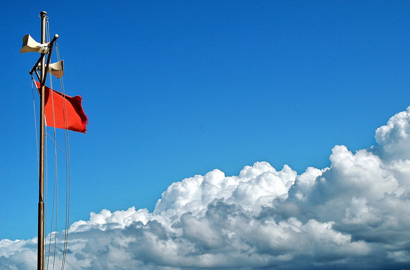 La bandiera che sventola da' un senso di fortino dopo la battaglia contro (contro il maltempo). Stonano le sirene sull' asta della bandiera, e forse c'è un po' troppo cielo e/o bianco (a mio gusto, ovviamente)