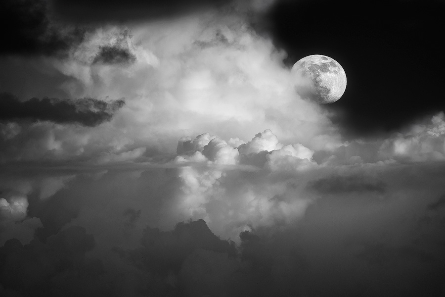 Ammirevole. Sei riuscito a fermare una situazione non comune, di una luna che si staglia nitida, non velata da residui di foschia, ma parzialmente schermata dalle nuvole nella parte inferiore sinistra. Che ora era quando hai scattato? il bianco delle nuvole indica, credo, che c'era ancora un bel po' di luce solare, quindi se il cielo è così nero è perché hai sottoesposto, penso; in sé, doveva essere un azzurro abbastanza scuro. Del resto, i dati che leggo, 100 ISO , f/5.6 e 1/200 sono quelli che ci volevano per una luna esposta correttamente, e in queste condizioni le nuvole se fossero state illuminate solo dalla luna sarebbero state quasi totalmente buie. Non deve essere stato facile realizzare questa foto; il risultato è ottimo. Ne hai anche la versione a colori? (dovrebbe essere piuttosto bella a sua volta).