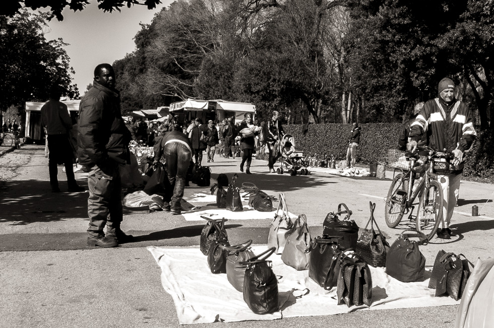Una scena molto italiana, il mercato rionale e alle sue estremità gli abusivi con la loro merce contraffatta, il cliente distratto che se ne va di corsa, altri che hanno già acquistato all'interno, mamma e papà cpn il pargoletto..